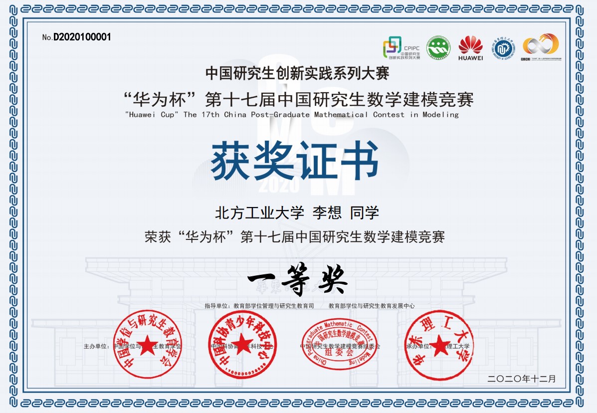 “华为杯”第十七届中国研究生数学建模竞赛成绩揭晓。米乐mile(中国区)官方网站研究生李想、张怡栋和李小白获得全国一等奖。