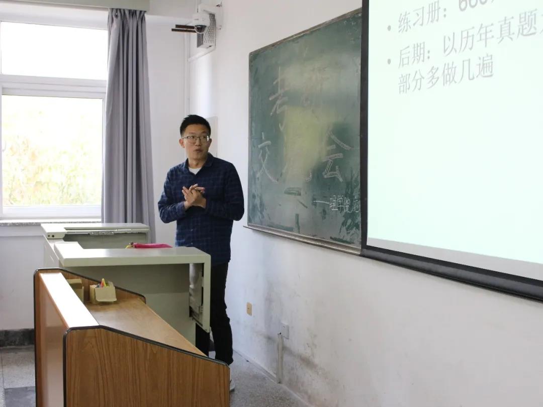 考取首都师范大学的殷硕、考取首都经济贸易大学的尚进以及考取本校研究生的岳世杰和张洪天等几位学长做了经验分享,他们分别从考研规划、信息调研准备工作、有关调剂方面的经验、考研过程中如何处理心理问题等多个角度讲述了个人的考研历程、经验。随后,同学们提出了许多考研复习过程中遇到的问题,学长们都给出了耐心细致的解答。