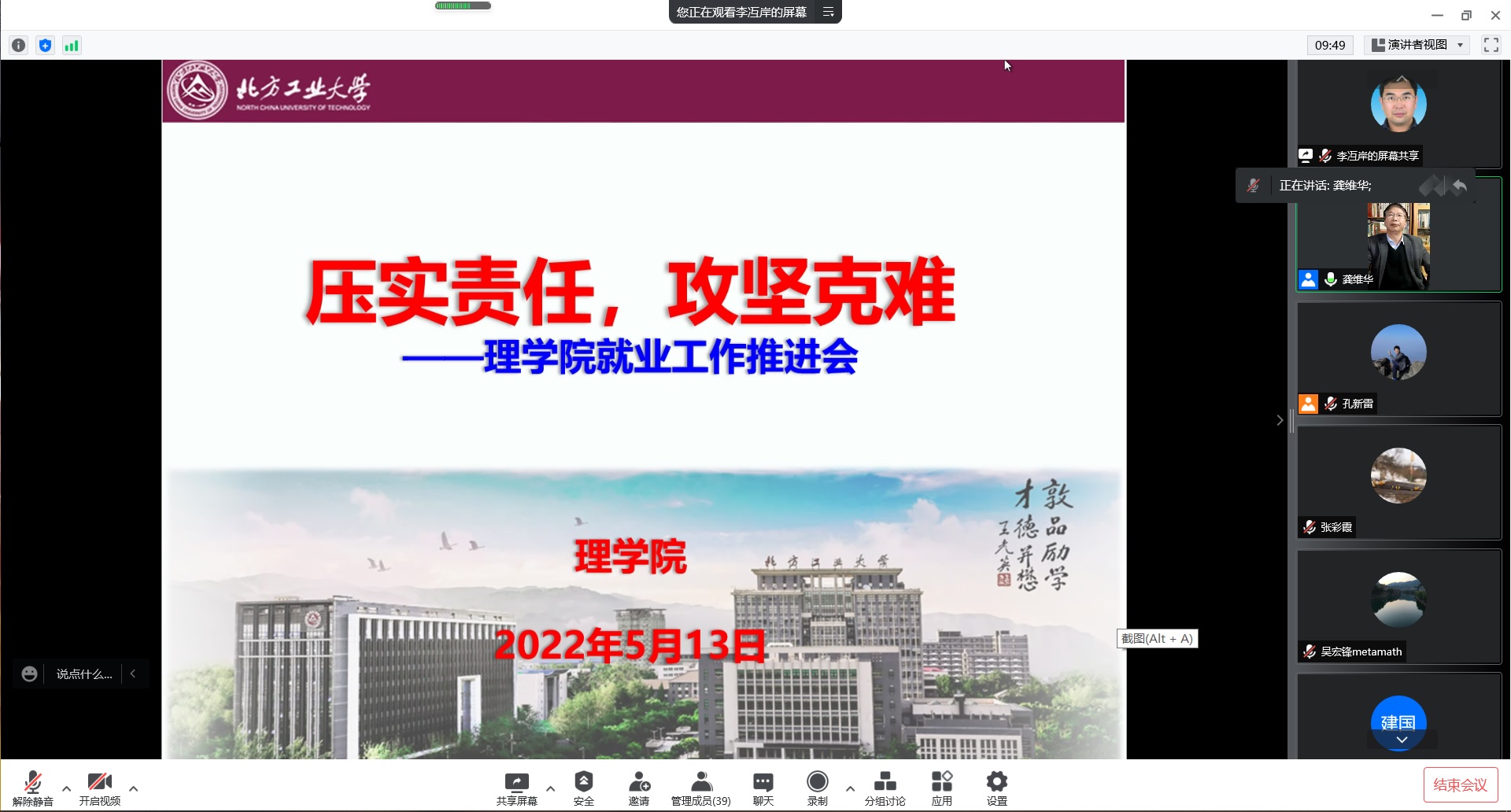 5月13日晚,米乐mile(中国区)官方网站召开2022届毕业生就业工作线上推进会,学院班子成员、各系主任、责任教授、学院全体研究生导师、数学系和统计系全体教师、办公室全体成员参加会议。会议由党委副书记李冱岸主持。