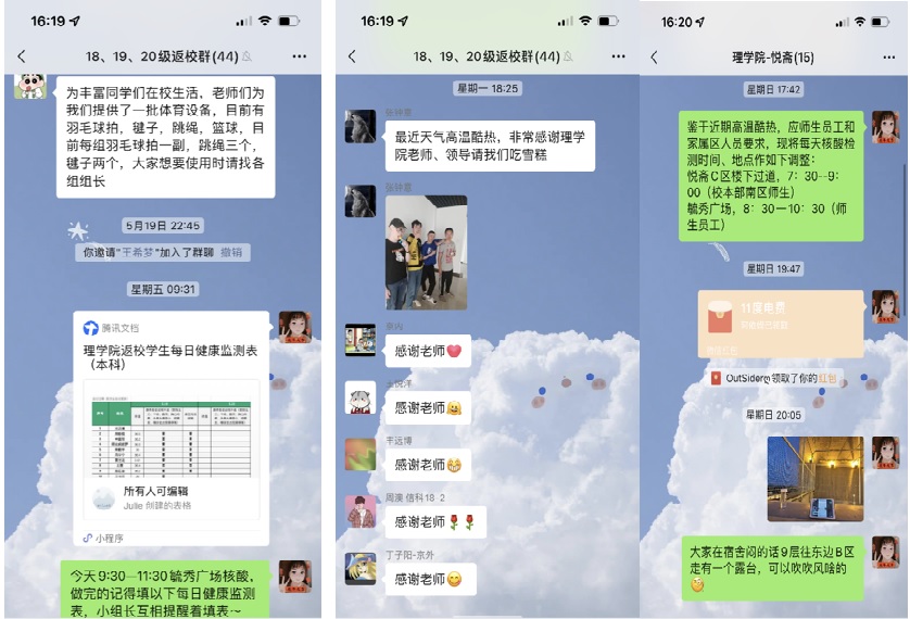 组织教职工和返校学生建立疫情防控党员先锋突击队和志愿者服务队、公寓构建楼长、层长、宿舍长管理服务体系,形成疫情防控的强大合力,凝聚合力织密防控网络,确保万无一失,使疫情传播“无处遁形”。