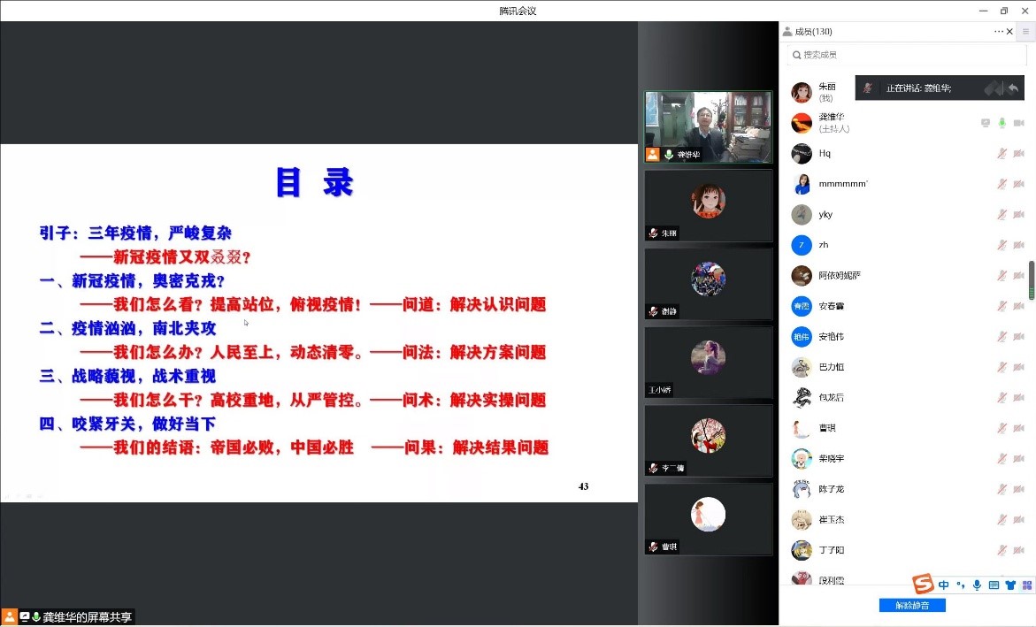 学院党委及时组织,召开全院师生疫情防控会议,传达上级和学校防疫情工作的安排部署。院党委书记龚维华以线上网络课堂的方式,向全院师生讲授主题为“保持战略定力 打赢防控战役”的疫情防控“大思政课”,进一步提高认识、统一思想、要求师生坚定不移“听党话、跟党走”,坚持“动态清零”方针不动摇,坚决把疫情防控作为当前学院工作的重中之重,坚决筑牢校园疫情防控屏障。