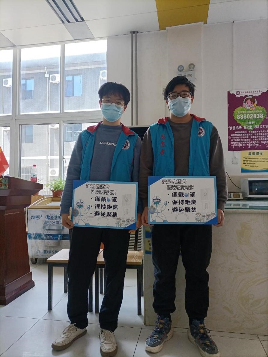 毕业生本科在校党员罗春阳、积极分子柴晓宇在校做好食堂引导、快递消杀等志愿工作