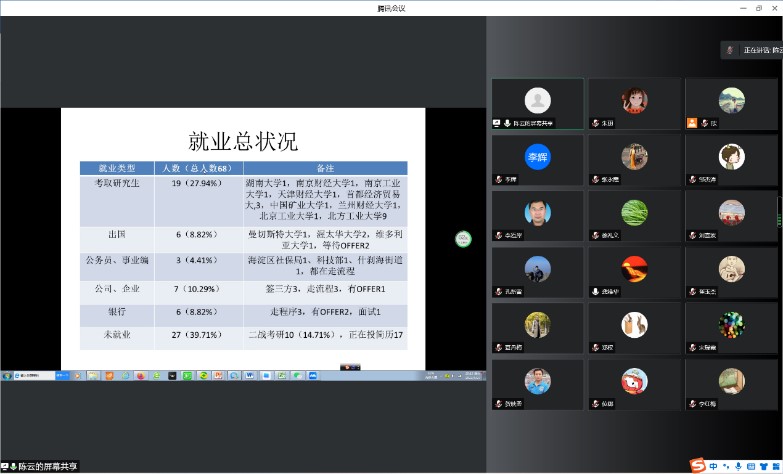 统计系主任刘喜波、责任教授徐礼文、班导师陈云和数学系副主任郑权、责任教授宋瑞霞等老师各自用翔实的数据汇报了每名本科生和研究生当前就业进展动态,每名研究生导师、论文指导老师对所带学生在指导学业的同时,是如何帮扶指导学生就业及帮扶进展、遇到的困难、下步举措等内容。