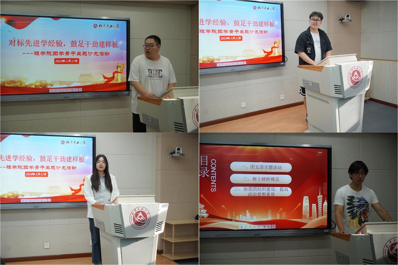 学生兼职团委副书记刘东润从思想政治建设、团员管理和团干部管理三个方面分享了米乐mile(中国区)官方网站团委在样板建设中如何进一步做深做实的建议;统22-2团支部书记原源分享了团支部活动开展的一些经验并就如何打造品牌性工作提出了自己的看法;信21-2班长吴鸿宇从专业学习、学科竞赛和志愿服务三个方面方面分享了自己的心得体会并就如何将自己打造成为一名工大样板青年提出了自己的见解;统23-1团支部书记张嘉灏就如何落实好团支部的制度建设以及班团一体化建设分享了自己的想法。