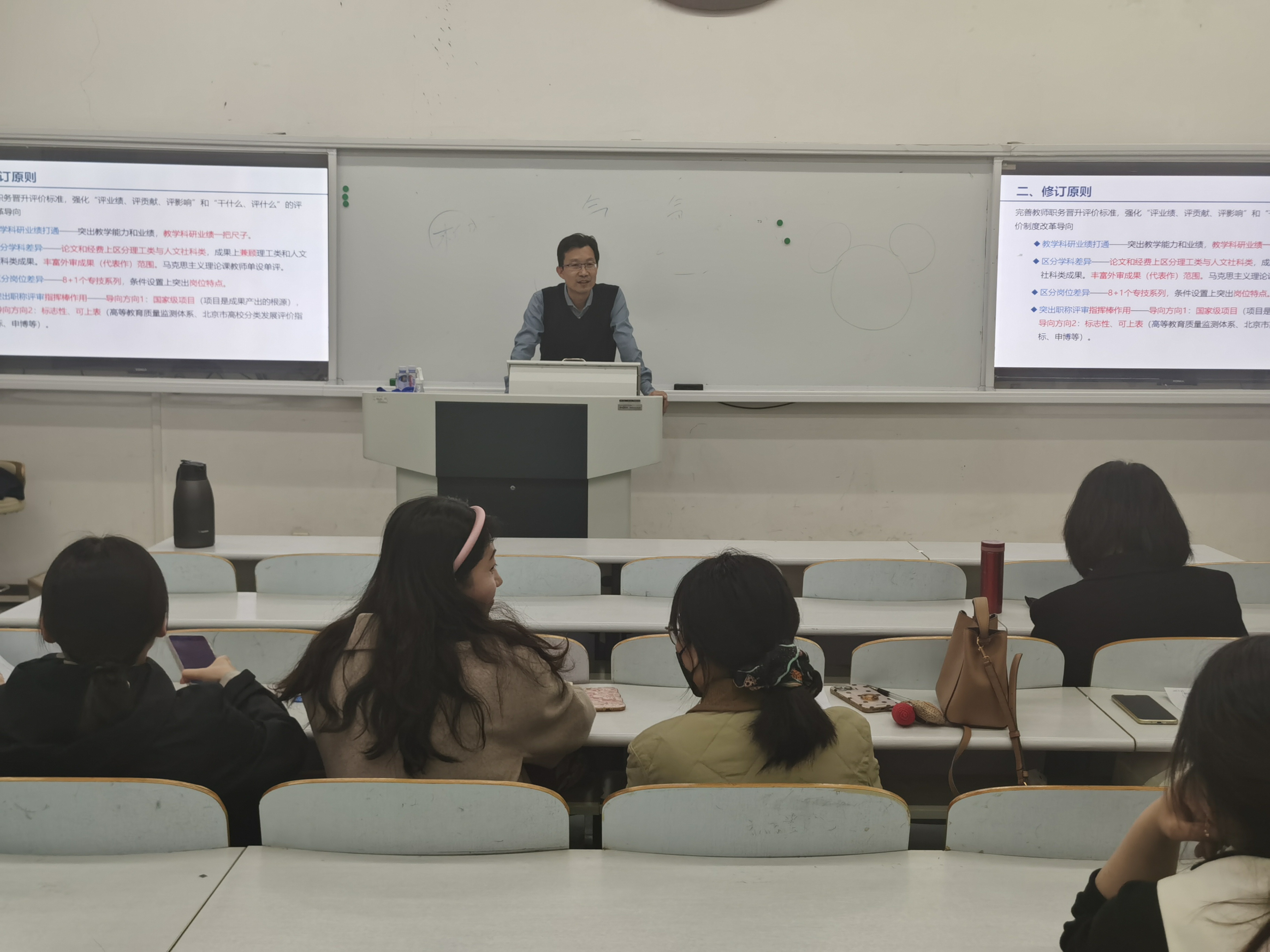焦志伟详细解读了学校近期出台的职称评审文件,对文件出台的背景、修订原则、修订过程、修订要点及修订的具体条款进行了说明;重点介绍了国家、北京市的高层次人才政策以及学校人才引育体系的框架、主要内容和近年来各人才项目的重点支持领域。焦志伟的报告内容详实、案例丰富,帮助学院教师更直观、更深入、更高效地了解了学校人事人才相关政策的内容和精神,助力教师进一步对标对表,合理进行职业生涯规划,促进学院事业和教师发展同频共振、有机融合。