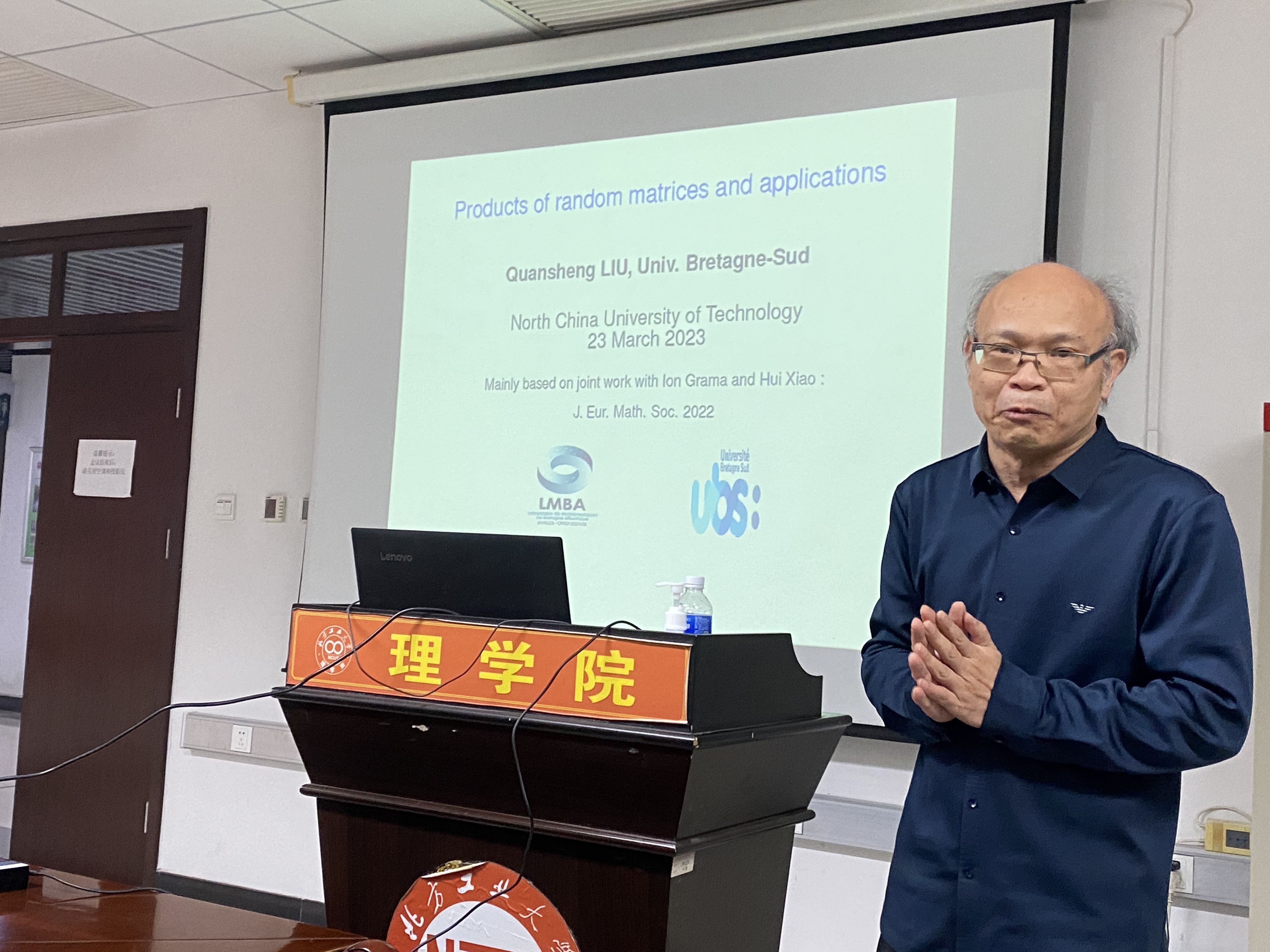应米乐mile(中国区)官方网站邀请,2023年3月23日下午,法国南布列塔尼大学刘全升教授来米乐官网讲学,在博远楼米乐mile(中国区)官方网站会议室805为米乐官网师生做了“随机矩阵的乘积及其应用”的学术报告。刘全升教授从概率中的中心定理、极限定理出发,详细地讲解了随机矩阵的乘积的历史背景,主要结果,以及在信息科学中的应用。刘全升教授还介绍了法国的数学文化、人才培养机制,并分析了法国之所以是数学强国的原因。