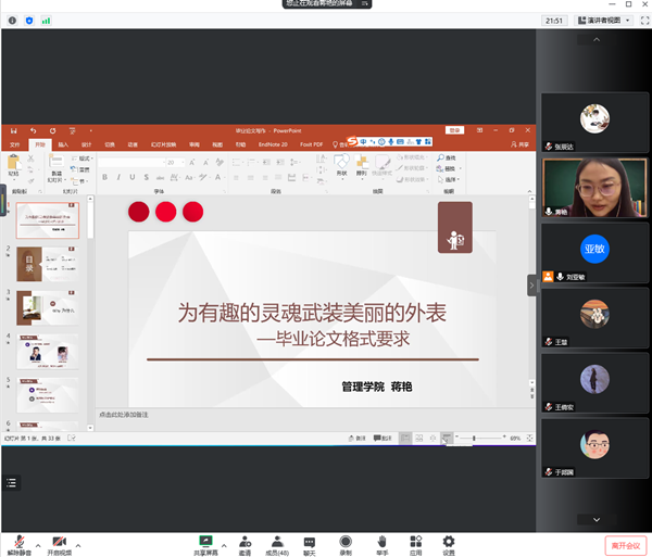 2022年11月4日下午,kaiyun电子官网kaiyun电子官网顺利开展了研究生毕业论文撰写专题培训会。此次讲座采用腾讯会议的形式进行,邀请kaiyun电子官网蒋艳副教授向2023硕士毕业生们讲解研究生毕业论文撰写的注意事项,学院研究生办刘亚敏老师介绍有关研究生毕业论文形式审查要求和管理流程。会议由kaiyun电子官网副院长王慧主持,kaiyun电子官网2020级研究生参加。